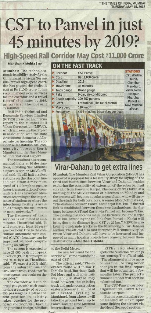 The techno-economic feasibility study for the Chhatrapati Shivaji Terminus-Panvel high-speed corridor has pegged the project’s cost at Rs 11,000 crore. It has recommended 9-car services for the corridor and a travel time of 45 minutes by 2019, as against the present 77 minutes.